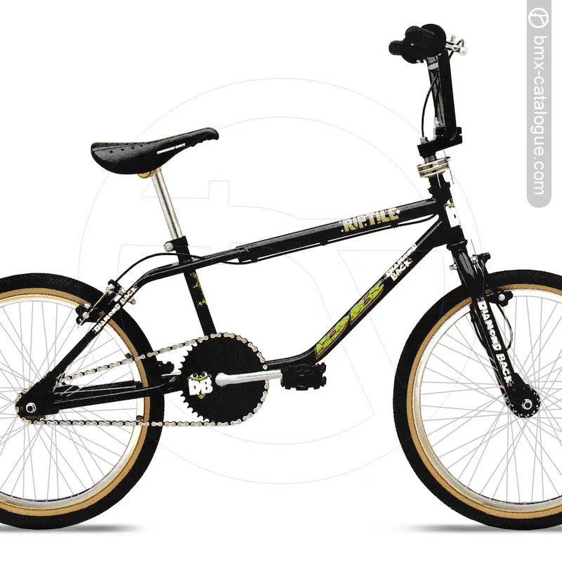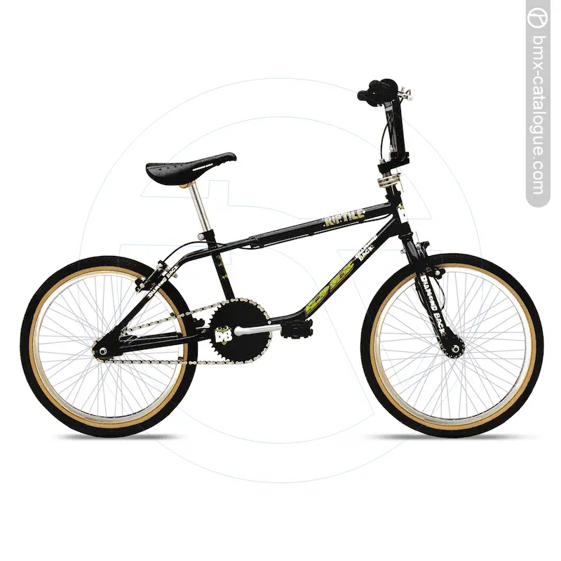 "The 1992 Diamond Back Riptile features a streetstyle frame, "ACS" pro rotor, Dia Compe "Bulldog" freestyle brakes and levers with built in peg mounts on frame & fork and 48 spoke alloy rims.