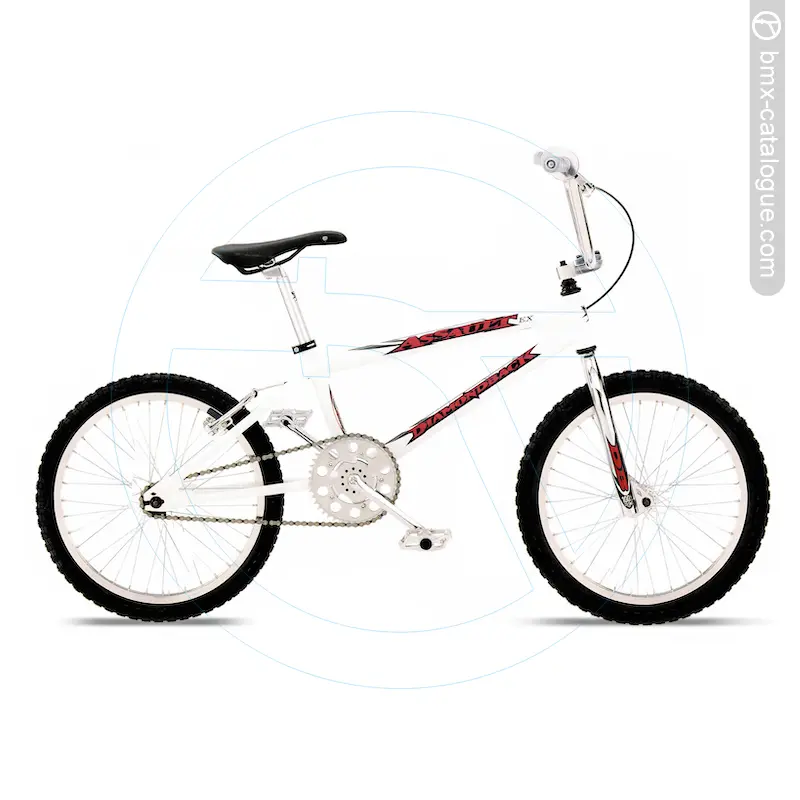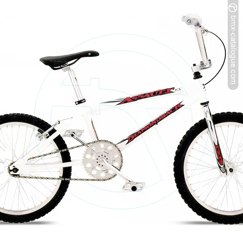 The 1998 Diamond Back Assault EX BMX features a lightweight 7005 alloy frame with oversized tubing and a gusseted head tube for added strength, paired with a DB fork using a 1” steerer and 1-1/4” chromoly blades finished in chrome. It comes fitted with DB MX-40 handlebars offering an 8-1/2” rise in chrome, held by a DB alloy four-bolt stem. Braking is handled by a Pro Max alloy linear-pull brake with matching lever, while the drivetrain uses a DB one-piece chromoly 175mm crank in chrome with a DB quick-change 44-tooth chainwheel, also in chrome, matched to DB alloy platform pedals with chromoly 1/2” axles. The wheelset consists of DB alloy 20x1.75” 36-hole rims, alloy hubs, and 14-gauge spokes, wrapped in Comp III-style tyres (20x2.125” front, 20x1.175” rear). Comfort comes via a DB padded seat with an alloy micro-adjust seatpost (27.0mm). Finish options were ball-burnished with a chrome fork, or white with a chrome fork.