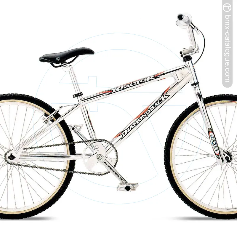 The 1998 Diamond Back Reactor 24 BMX features a lightweight 7005 aluminium frame with oversized tubing, a double-butted down tube, double-thick dropouts, and a gusseted head tube for added strength, paired with a full chromoly fork using a 1-1/8” threadless steerer and 1-1/4” blades. It comes fitted with DB chromoly cruiser handlebars offering a 6” rise, held by a forged alloy A-head stem (1-1/8” threadless). Braking is handled by a Dia-Compe 757 linear-pull brake with Dia-Tech MX-1 lever, while the drivetrain uses a DB two-piece chromoly 180mm crank in chrome with a DB alloy 41-tooth chainwheel, also in chrome, matched to DB alloy platform pedals with chromoly 9/16” axles. The wheelset consists of Alex alloy double-wall 24x1.75” 36-hole rims, DB Slasher alloy hubs, and 14-gauge stainless spokes, wrapped in Toga Comp III 24x1.75” tyres. Comfort comes via a DB padded seat with 8mm rails and an alloy micro-adjust seatpost (27.0mm). The bike was finished in ball-burnished with a chrome fork.
