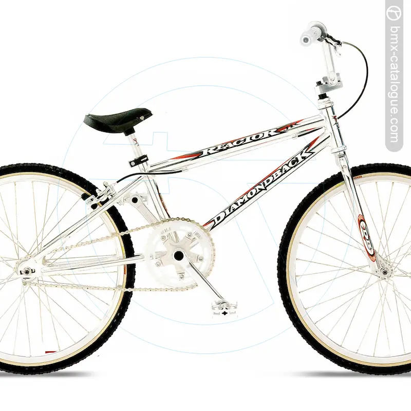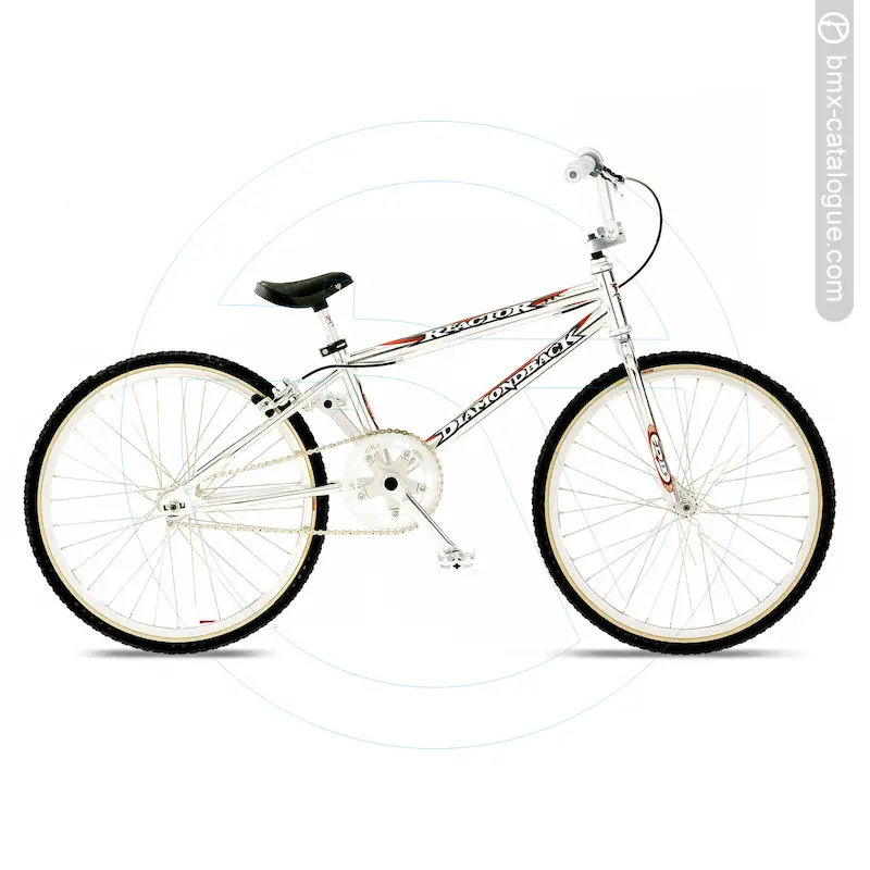 The 1998 Diamond Back Reactor JR BMX features a lightweight 7005 aluminium frame with a threaded bottom bracket and 1” head tube, paired with a chromoly fork using 1” blades and finished in chrome. It comes fitted with DB 7005 alloy handlebars offering a 5” rise, held by an alloy four-bolt stem with chromoly shaft. Braking is handled by an alloy caliper with Dia-Compe MX-101 alloy lever, while the drivetrain uses forged alloy 165mm crank arms with an alloy spider and 43-tooth alloy chainwheel, matched to DB alloy pedals with chromoly 9/16” axles. The wheelset consists of Alex double-wall alloy 32-hole rims, alloy precision sealed-bearing hubs with chromoly hollow flip-flop rear axles, and stainless spokes, wrapped in Tioga Comp III 20x1-3/8” tyres. Comfort comes via a DB one-piece seat with integrated alloy post. The bike was finished in ball-burnished with a chrome fork.