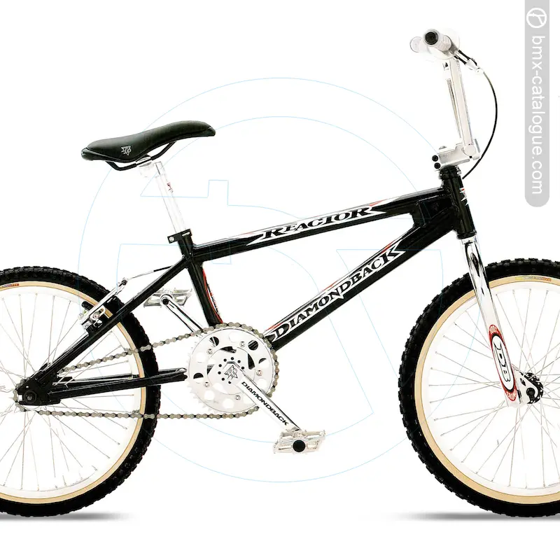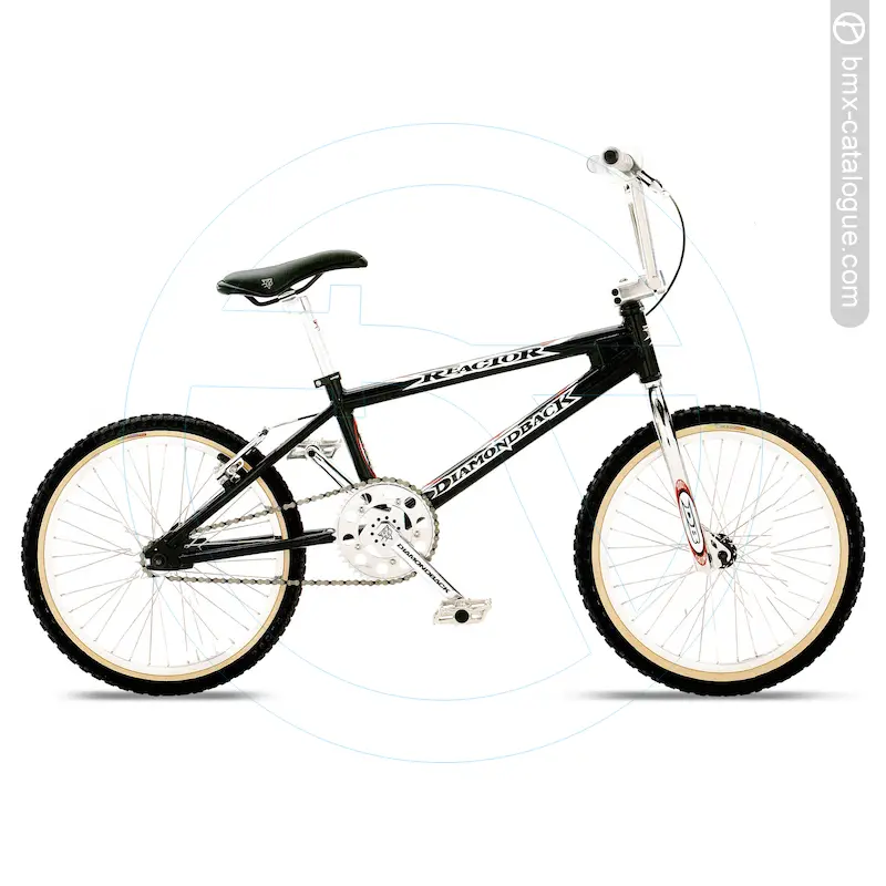 The 1998 Diamond Back Reactor BMX features a lightweight 7005 aluminium frame with oversized tubing, a double-butted down tube, double-thick dropouts, and a gusseted head tube for added strength, paired with a full chromoly fork using a 1-1/8” threadless steerer and 1-1/4” blades. It comes fitted with 4-piece chromoly handlebars offering an 8-1/2” rise in chrome, held by a forged alloy Ahead-style stem. Braking is handled by a Dia-Compe 757 linear-pull brake with Dia-Tech MX-1 lever, while the drivetrain uses a DB two-piece chromoly 180mm crank in chrome with a DB alloy quick-change 44-tooth chainwheel, also in chrome, matched to DB alloy platform pedals with chromoly 9/16” axles. The wheelset consists of Alex alloy double-wall 20x1.75” 36-hole rims, DB Slasher alloy hubs, and 14-gauge stainless spokes, wrapped in Tioga Comp II tyres (20x2.125” front, 20x1.75” rear). Comfort comes via a DB padded seat with 8mm rails and an alloy micro-adjust seatpost (27.0mm). Finish options were ball-burnished with a chrome fork, or black with a chrome fork.
