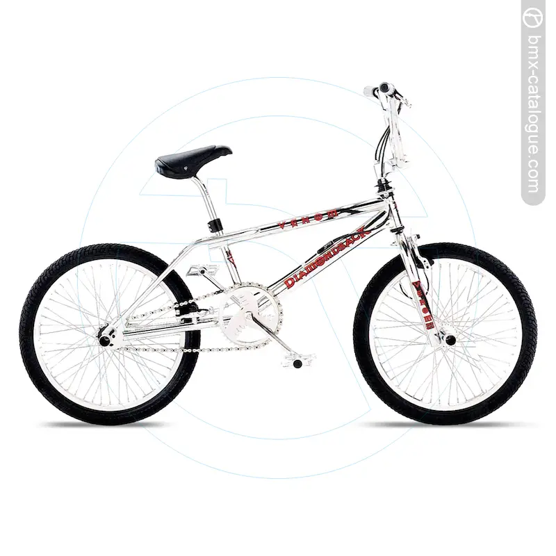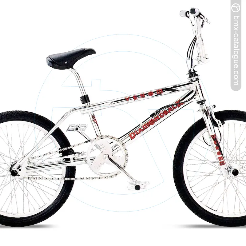 The 1998 Diamond Back Venom X BMX features a full chromoly freestyle frame with oversized tubing, double-thick dropouts, and reinforced bottom bracket and head tube, paired with a matching full chromoly fork using 1-1/4” blades and reinforced dropouts. It comes fitted with DB 4-piece chromoly handlebars offering an 8” rise in chrome, held by a DB alloy stem with chromoly shaft. Braking is handled by a Dia-Compe 990 U-brake at the rear with a Dia-Compe Bull Dog front brake, both operated by Dia-Compe MX-99 alloy levers. The drivetrain uses a DB one-piece chromoly 175mm crank in chrome with a DB 44-tooth alloy chainwheel, also in chrome, matched to DB alloy platform pedals with chromoly 1/2” axles. The wheelset consists of Alex alloy double-wall 48-hole rims, high-flange alloy hubs, and 14-gauge stainless spokes, wrapped in DB freestyle 20x1.95” tyres. Comfort comes via a DB padded freestyle seat with a chromoly micro-adjust seatpost (25.4mm), while extras include an SST Ory 1” rotor and front and rear threadless pegs. The bike was finished in full chrome.
