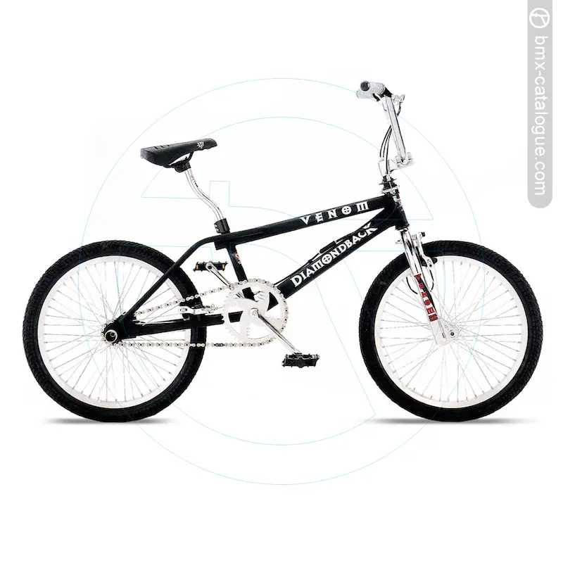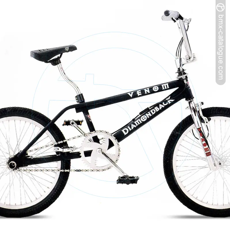 The 1998 Diamond Back Venom BMX features a freestyle-designed frame with oversized tubing, a chromoly down tube, and double-thick dropouts for added durability, paired with a chromoly fork using 1-1/4” blades and reinforced dropouts. It comes fitted with DB freestyle handlebars offering an 8-1/2” rise in chrome, held by a DB alloy four-bolt stem. Braking is handled by an alloy U-brake at the rear with a Dia-Compe Bull Dog front brake and alloy levers, while the drivetrain uses a DB one-piece chromoly 175mm crank in chrome with a DB 44-tooth chainwheel, matched to DB resin platform pedals with 1/2” axles. The wheelset consists of DB alloy 48-hole 20x1.75” rims, alloy hubs, and 14-gauge spokes, wrapped in DB freestyle 20x1.95” tyres. Comfort comes via a DB freestyle seat with 9mm rails and a chromoly layback seatpost (25.4mm). Finish options were full chrome, or flat black with a chrome fork.