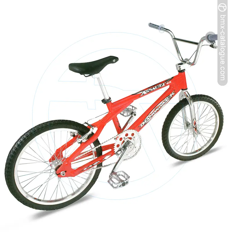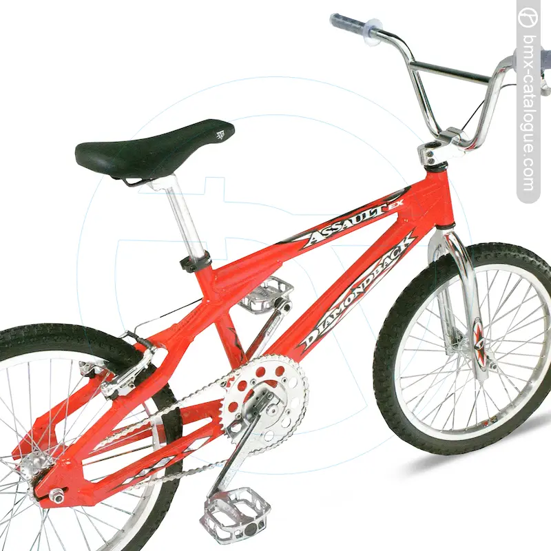 The 1999 Diamond Back Assault EX BMX features a lightweight 6061 alloy Franko-design frame, paired with a full chromoly fork using a 1-1/8” threadless steerer, 1-1/4” blades, and a chrome finish. It comes fitted with handlebars offering an 8” rise in chrome, held by an alloy A-head stem (1-1/8”). Braking is handled by a Tektro alloy linear-pull brake with matching lever, while the drivetrain uses a DB three-piece chromoly 175mm crank in chrome with a quick-change 44-tooth chainwheel, also in chrome, matched to alloy platform pedals with chromoly 9/16” axles. The wheelset consists of alloy double-wall 20x1.75” 36-hole rims, alloy hubs, and 14-gauge stainless spokes, wrapped in Comp III-style tyres (20x2.125” front, 20x1.75” rear). Comfort comes via a padded seat with alloy seatpost.