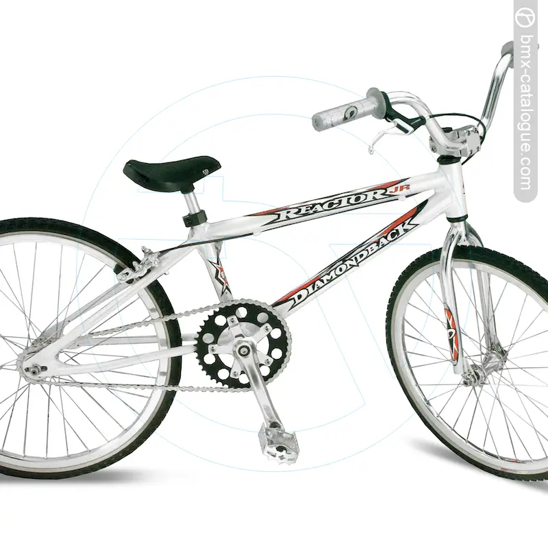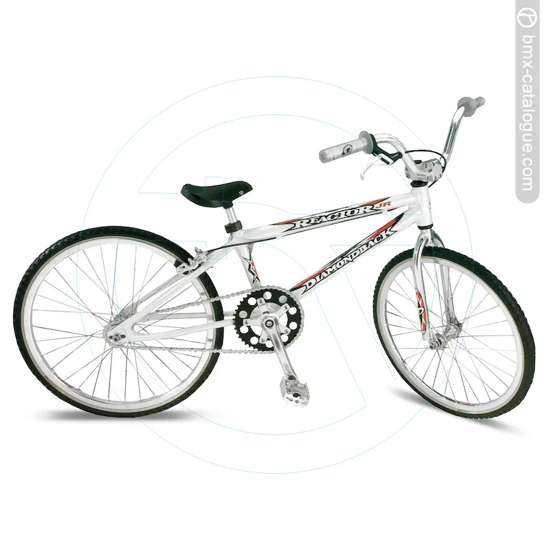 The 1999 Diamond Back Reactor JR BMX features a lightweight 6061 alloy frame with a threaded bottom bracket and gusseted head tube, paired with a full chromoly 1” threadless fork using 1” blades. It comes fitted with alloy handlebars offering a 5” rise, held by an alloy four-bolt A-head stem. Braking is handled by an alloy caliper brake with Tektro alloy lever, while the drivetrain uses a forged alloy 165mm crankset with a 43-tooth alloy chainwheel, matched to alloy pedals. The wheelset consists of Alex double-wall alloy 32-hole rims, alloy precision sealed-bearing hubs with chromoly hollow flip-flop rear axle, and stainless spokes, wrapped in Tioga Comp III 20x1-3/8” tyres. Comfort comes via a one-piece seat with integrated alloy post.