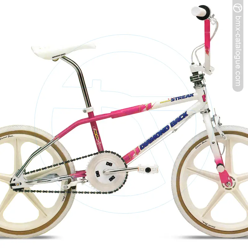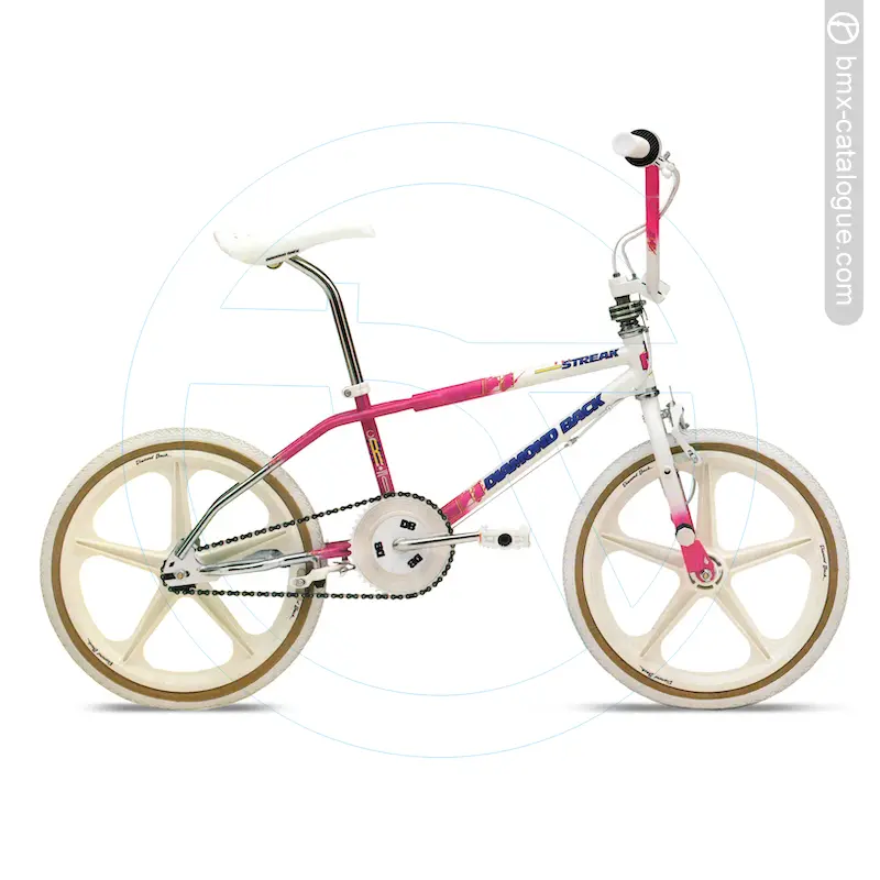 Hot Streak. Just that name brings fear to those who don't ride one. This year will be no exception. 1988 brings to the Hot Streak the exact frame that is used on the Strike Zone. The capabilities of this bike are for you to explore. Try to find its limits; we haven't yet. Only the ultimate in freestyle components go onto the Hot Streak, including ACS Pro Rotor, AGS Tangent Gripper series braking system, Diamond Back's rotor stem for better handling, and DB'Zytel Mag wheels. All this on one bike at the Hot Streak price; you ve got to admit this bike was bred to shred. Colors - White/Rhodamine Red/Chrome, White/Aqua/Chrome.