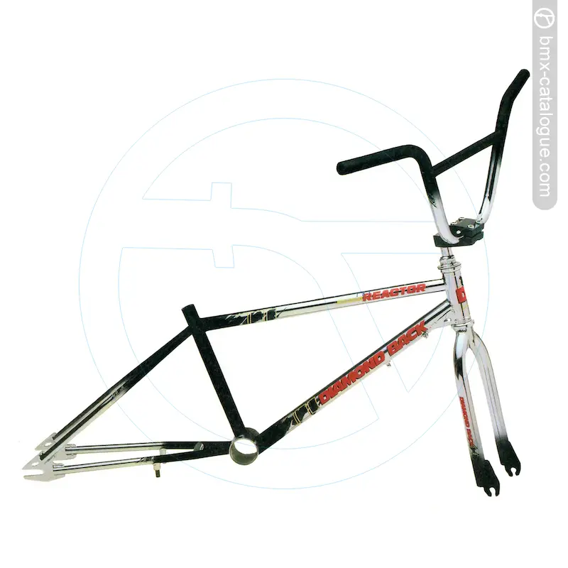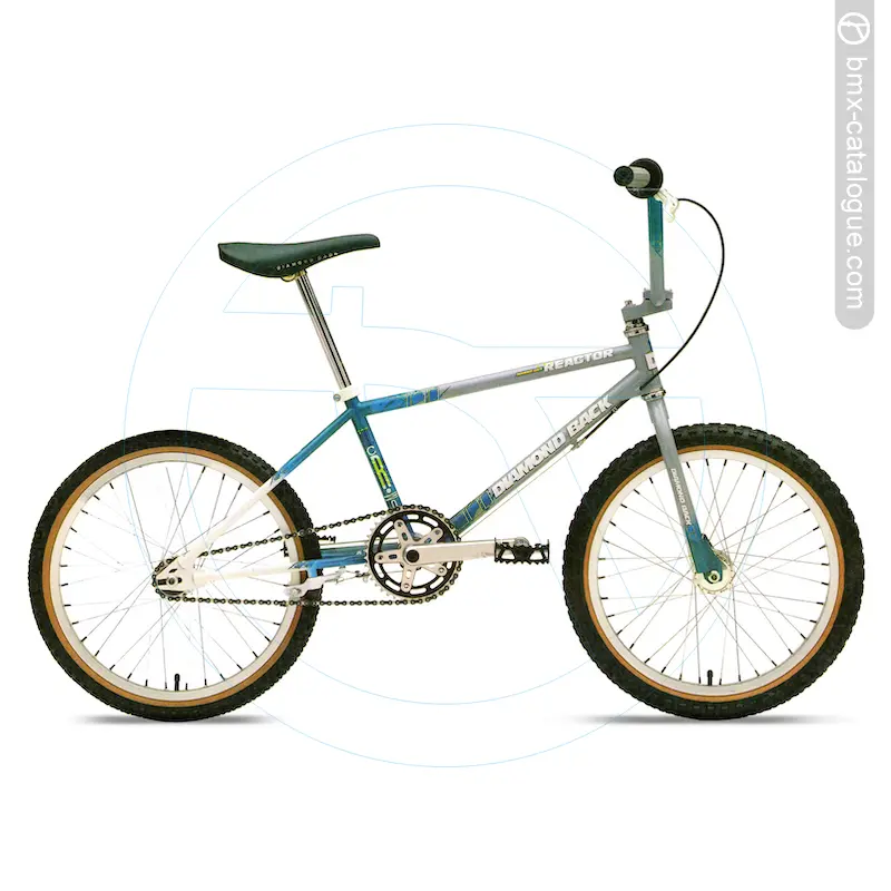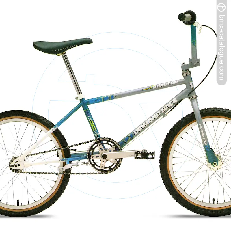 Diamond Back asked their top three pro racers. Harry Leary. Eddy King, and Doug Davis, with 36 years total combined racing experience, to design a bike that would crush our competitors. The 1988 Diamond Back Reactor reacts to your every move with precise and predictable results. All control is directed through Diamond Back's new racing handlebar and stem. Power is applied through Diamond Back's newly designed alloy cranks, with the exclusive machined, removable spider. As you would expect, the component list is ear shattering. Reliable and powerful - that's the Reactor. Colors - Gray/Aqua/White, Chrome/Black/Chrome.