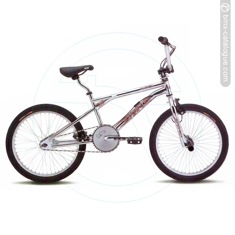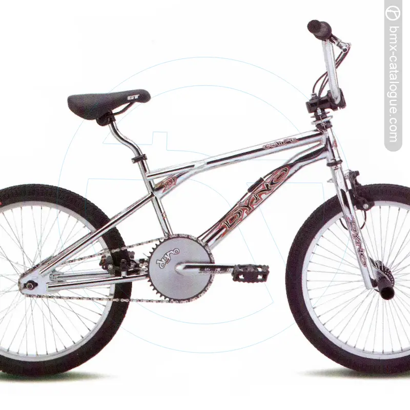 1999 Dyno Compe. Dyno flatland frame with CrMo downtube, extra thick 6mm dropouts and U-brake bosses. Dyno freestyle fork with 1-1/4-inch legs and 6mm dropouts Dyno CD chainwheel. Dyno Hoop-D tires. Dyno freestyle handlebar with gussets * GT aluminum piston design stem. Dyno Drainpipe II seatpost with GT Piston seatpost clamp. GT Kraton freestyle grips. Steel deep socket axle pegs, one pair. Tektro U-brake rear. Colors available: CP, Gloss Black, Brown Sugar.