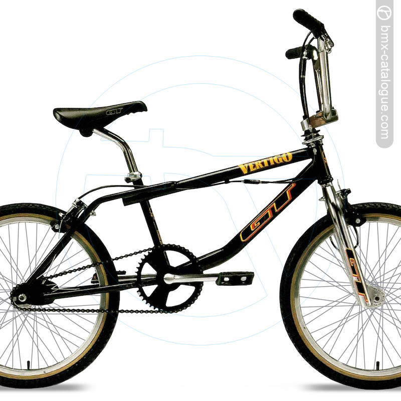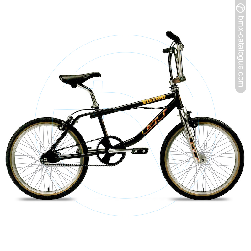 1995 GT Vertigo. The GT Vertigo is the ideal all-around bicycle. Featuring 48 hole spoked rims, chromoly main tubes, DiaCompe brakes and GT nylon saddle, the Vertigo is able to handle freestyle riding or around town riding in style. Colors: Chrome Plated, Black, and Blacklight..