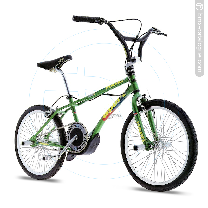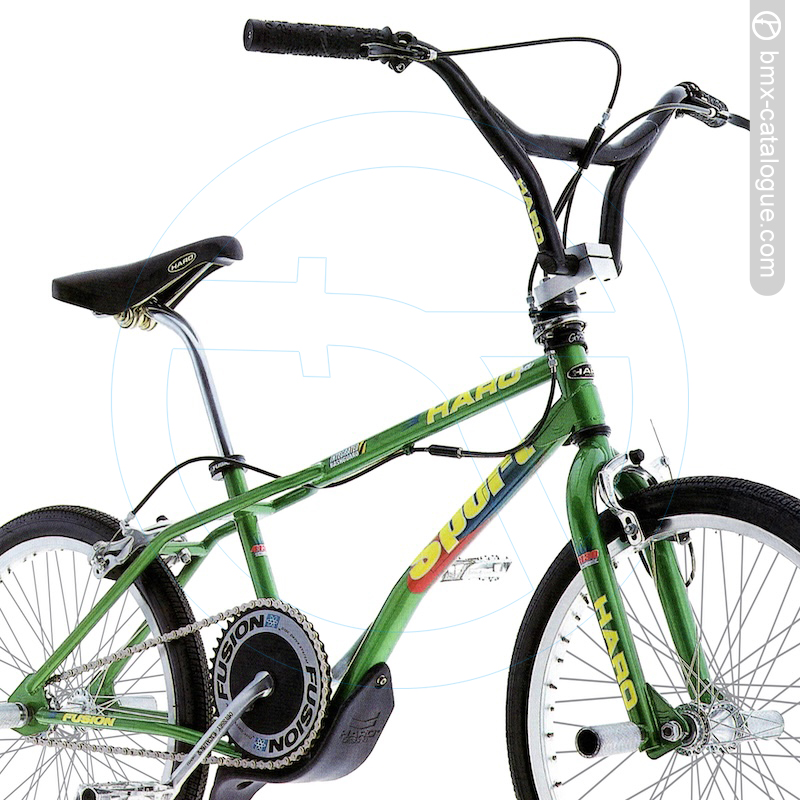 The overwnelming choice of freestylers woridwide... Haro Kneesaver bars. Refined for '93. Flatter bend. Reshaped slant end cap. 110% CRMO. Fusion stem. Computer machined from a solid billet of aluminum. CRMO shaft. CRMO hollow bolt. Odyssey Gyro cable detangler. Classic Sport two-into-one top tube design New for '93 is oversized 25.4mm/1" seatpost for greater durability. Fusion Unitorque seatoost clamp: lightweight design. heavyweight clamping power. Haro Air Master pegs. Available in two styles: Fork and axle. 100% CRMO axle. Replaceable nylon sleeves for fast predictable grinds on concrete, coping railings whatever. When you wear one side out, simply flip the sleeve over and grind on