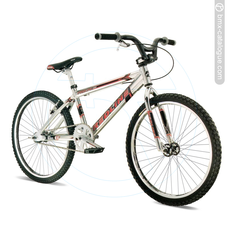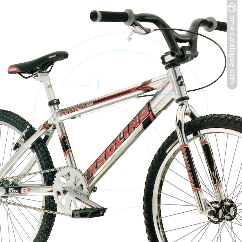 2000 Redline Proline Team 24. Are you ready for the best cruiser money can buy? Flight equipped, main event reacly. FRAME Proline Pro Cruiser-6061-T6 Alloy w/ Super Squareback Stays FORK REDLINE Butted 4130 Chromoly H/BAR REDLINE Forklifter Alloy 4.5" Rise STEM REDLINE Flight Stem Threadless GRIP REDLINE Dual Density Freaky G HEADSET Dia Compe SX Ahead® BB SET REDLINE Flight Sealed CRANK REDLINE Flight Cranks Custom Sized C/RING REDLINE Flight Gear II Custom Size TIRE SET Tioga Comp III 24X1.75/2.215 Skinwall RIM ALEX Supra b (Beta) Eyeletted 24X1.75 Chrome SPOKE 14G Stainless Steel HUB SET REDLINE Sealed Flight Hubs 36H Flip Flop F/WHL Shimano® 18T Chrome R.BRAKE Tektro BX-20 V-Type w/ Roller Guide R.LEVER Tektro 318A Talon CHAIN KMC Chrome 3/32" SADDLE REDLINE Pro Saddle II w/ Kevlar S/POST REDLINE Alloy w/ Micro-adjust PEDAL REDLINE Sealed Flight Pedal S/CLAMP REDLINE PADSET REDLINE COLORS Team Two Tone or Hi-Polished (Shown).