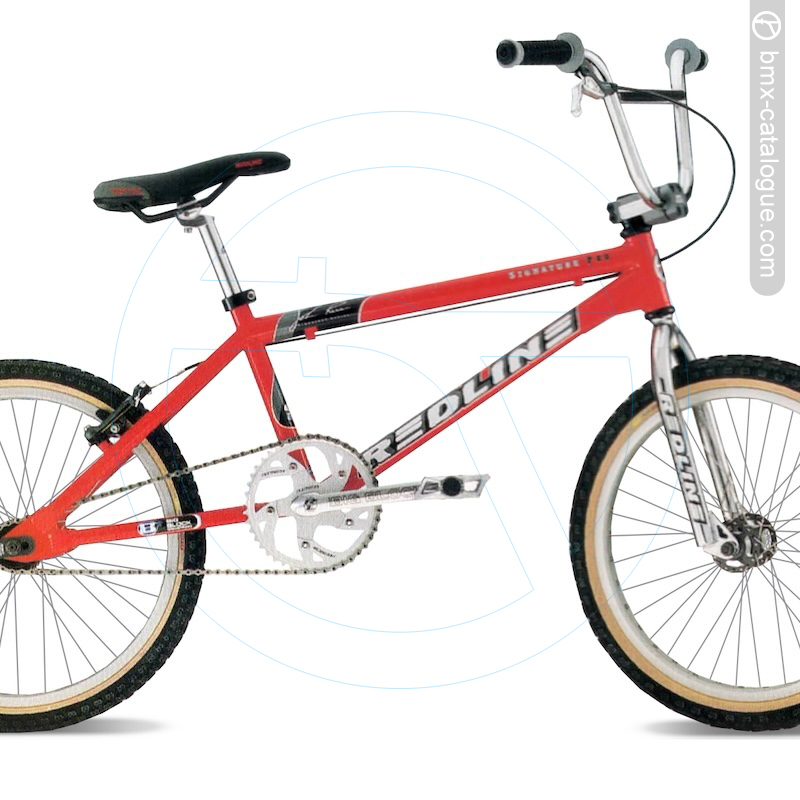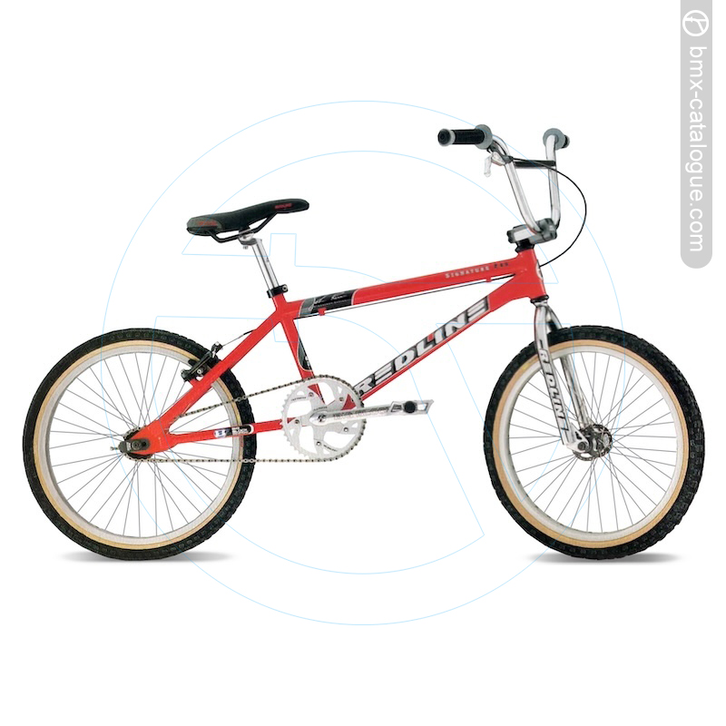 2000 Redline Signature Pro. 100% Chromoly done the right way. Jackal approved. FRAME Signature Pro-100% 4130 Chromoly w/ Double Butted Top and Down Tubes FORK REDLINE Butted 4130 Chromoly H/BAR REDLINE Pro w/ 8" Rise STEM REDLINE Flight Stem Threadless GRIP REDLINE Dual Density Freaky G HEADSET Tioga TG Threadless BB SET REDLINE Big Block Loose Ball CRANK REDLINE Big Block 180mm Chromoly C/RING Alloy 44T TIRE SET Tioga Comp III 20X1.75/2.215 Skinwall RIM ALEX 7X23F 20X1.75 w/ Eyelets SPOKE 14G Stainless HUB SET REDLINE Flight Hubs Sealed-Flip Flop F/WHL 16T R.BRAKE Tektro 915A V-Type R.LEVER Tektro Talon CHAIN KMC Chrome 3/32" SADDLE REDLINE Padded Pro Kevlar Saddle S/POST REDLINE Alloy w/ Micro-adjust PEDAL REDLINE Platform-Alloy S/CLAMP REDLINE PADSET REDLINE EXTRAS REDLINE Chain Tensioners COLORS Chrome Plated (Showh) or Classic Red